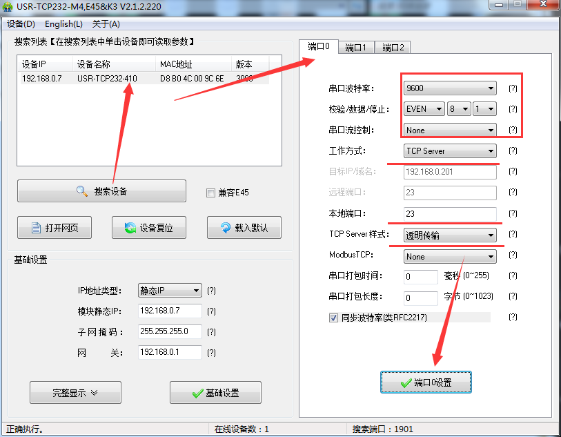 1:將串口服務(wù)器網(wǎng)口直連電腦網(wǎng)口或者連接路由器網(wǎng)口。使用設(shè)置軟件設(shè)置參數(shù):搜索設(shè)備,設(shè)置串口服務(wù)器的IP地址與局域網(wǎng)網(wǎng)段一致,設(shè)置串口服務(wù)器的波特率為9600,校驗(yàn)數(shù)據(jù)位停止位:EVEN 8 1。這個(gè)參數(shù)要和PLC的參數(shù)一致。打包時(shí)間和長(zhǎng)度都設(shè)置為0.然后端口0設(shè)置。(注:搜索到的版本要在3006及3006以上才支持)