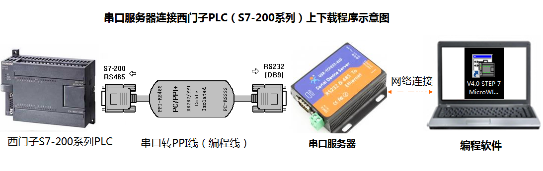 硬件連接:S7-200 PLC連接PPI編程線纜,PPI編程線纜的RS232端連接串口服務(wù)器的RS232口,串口服務(wù)器網(wǎng)口連接電腦網(wǎng)口或者路由器網(wǎng)口。