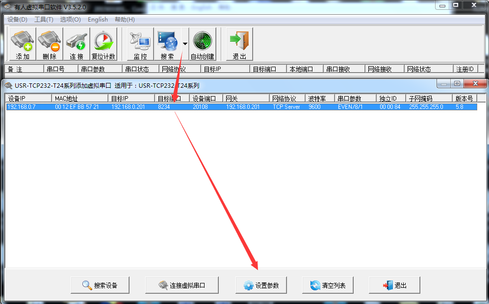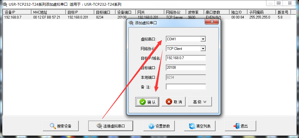 使用虛擬串口軟件搜索串口服務(wù)器,選擇USR-TCP232-T24。