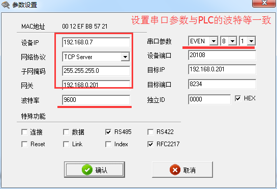 2:設(shè)置串口服務(wù)器的IP地址與局域網(wǎng)網(wǎng)段一致,設(shè)置串口服務(wù)器的波特率為9600,校驗(yàn)數(shù)據(jù)位停止位:EVEN 8 1。這個(gè)參數(shù)要和PLC的參數(shù)一致。然后點(diǎn)擊確認(rèn)。