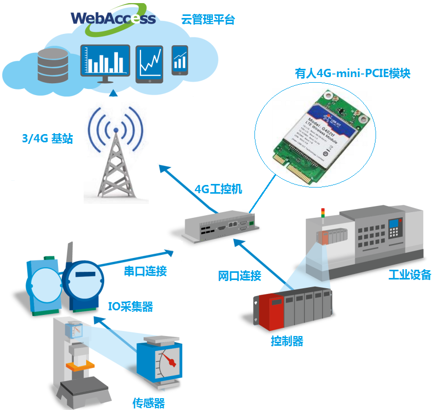 1:實現(xiàn)功能:研華工控機,內(nèi)部自帶mini-PCIE接口,內(nèi)部可以插接mini-PCIE接口的WiFi和4G模塊,實現(xiàn)工控機的聯(lián)網(wǎng)。連接上4G模塊后,工控機不用連接寬帶網(wǎng)絡(luò)即可實現(xiàn)工控機上網(wǎng),可以把現(xiàn)場的數(shù)據(jù)發(fā)送到遠(yuǎn)端工控云管理平臺上。