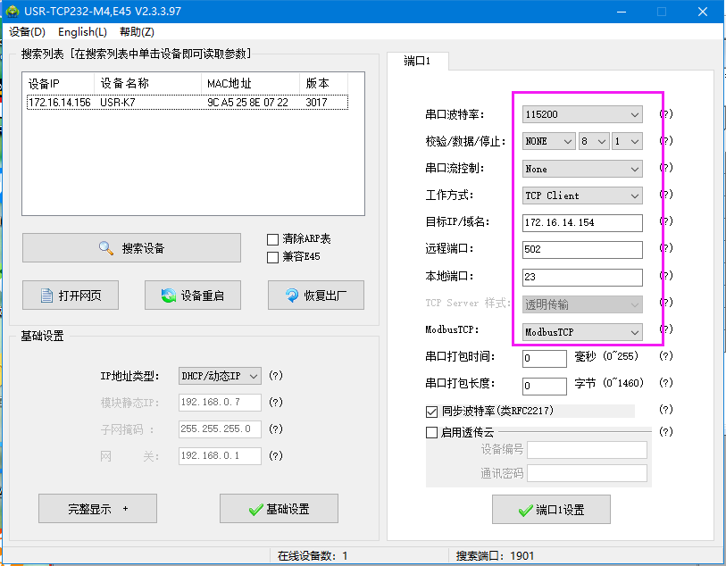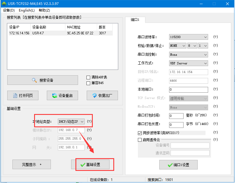 1.用M4設(shè)置軟件搜索K7的IP。出廠默認(rèn)是192.168.0.7,修改成DHCP/動態(tài)ip,保存設(shè)置。