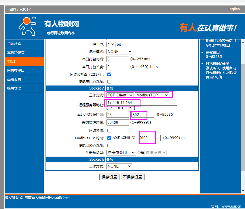 網(wǎng)頁檢查串口參數(shù),工作方式設(shè)置TCP server ModbusTCP,本地端口號默認(rèn)是8899,我這邊修改成了8845,Modbus TCP輪詢默認(rèn)是關(guān)閉,需要勾選MODBUS TCP輪詢時(shí)間。保存設(shè)置,重啟參數(shù)生效。