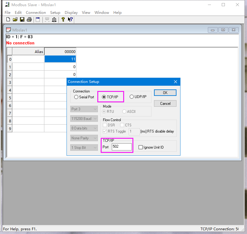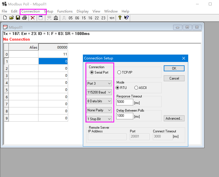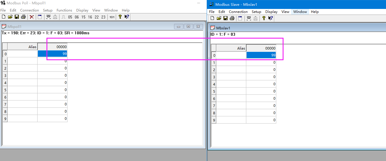 模擬測試用MODBUS SLAVE軟件做網(wǎng)口設(shè)備,用MODBUS POLL軟件做串口端。