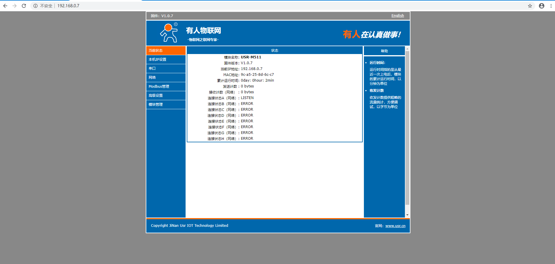1.將 Modbus網(wǎng)關(guān)M511(USR-M511,簡(jiǎn)稱 511 下同)的串口通過(guò)串口線(或USB 轉(zhuǎn)串口線)與計(jì)算機(jī)相連接,通過(guò)網(wǎng)線將 511 的網(wǎng)口 PC 的網(wǎng)口相連接,檢測(cè)硬件連接無(wú)錯(cuò)誤后,接入我們配送的電源適配器,給 511 供電。觀察指示燈狀態(tài)確定511是否正常工作:紅色燈(power)常亮,綠色燈(work)閃爍。(注意:撥碼開關(guān)和選擇串口一致)
