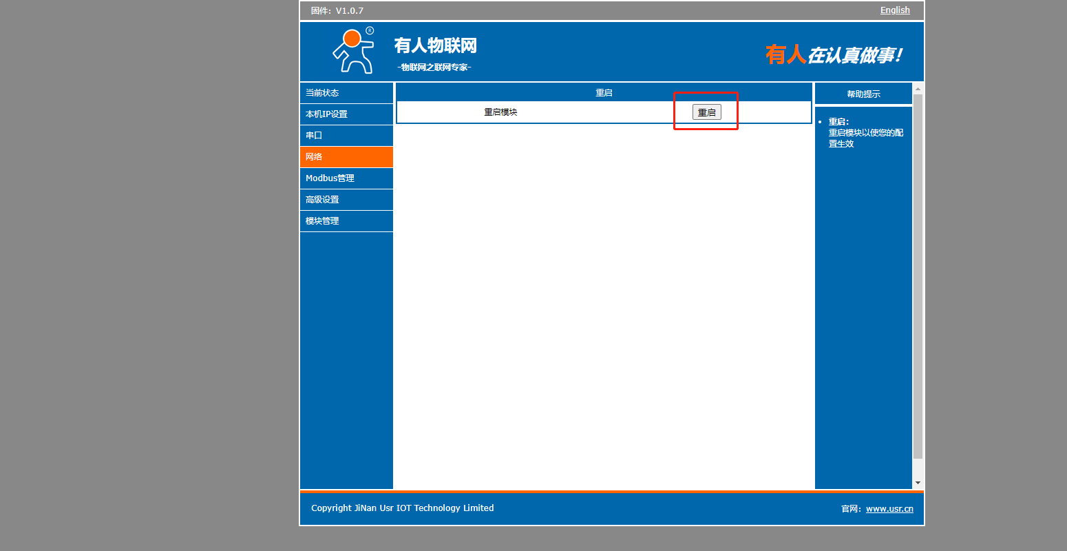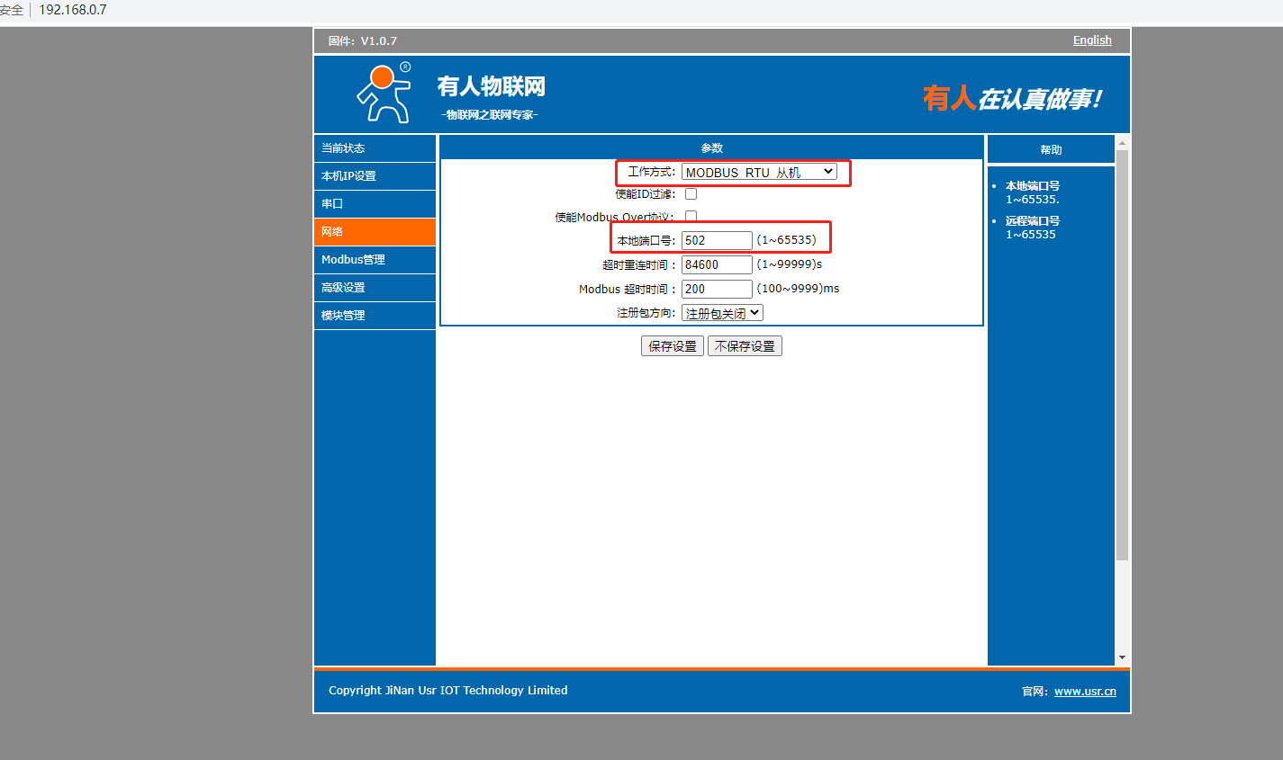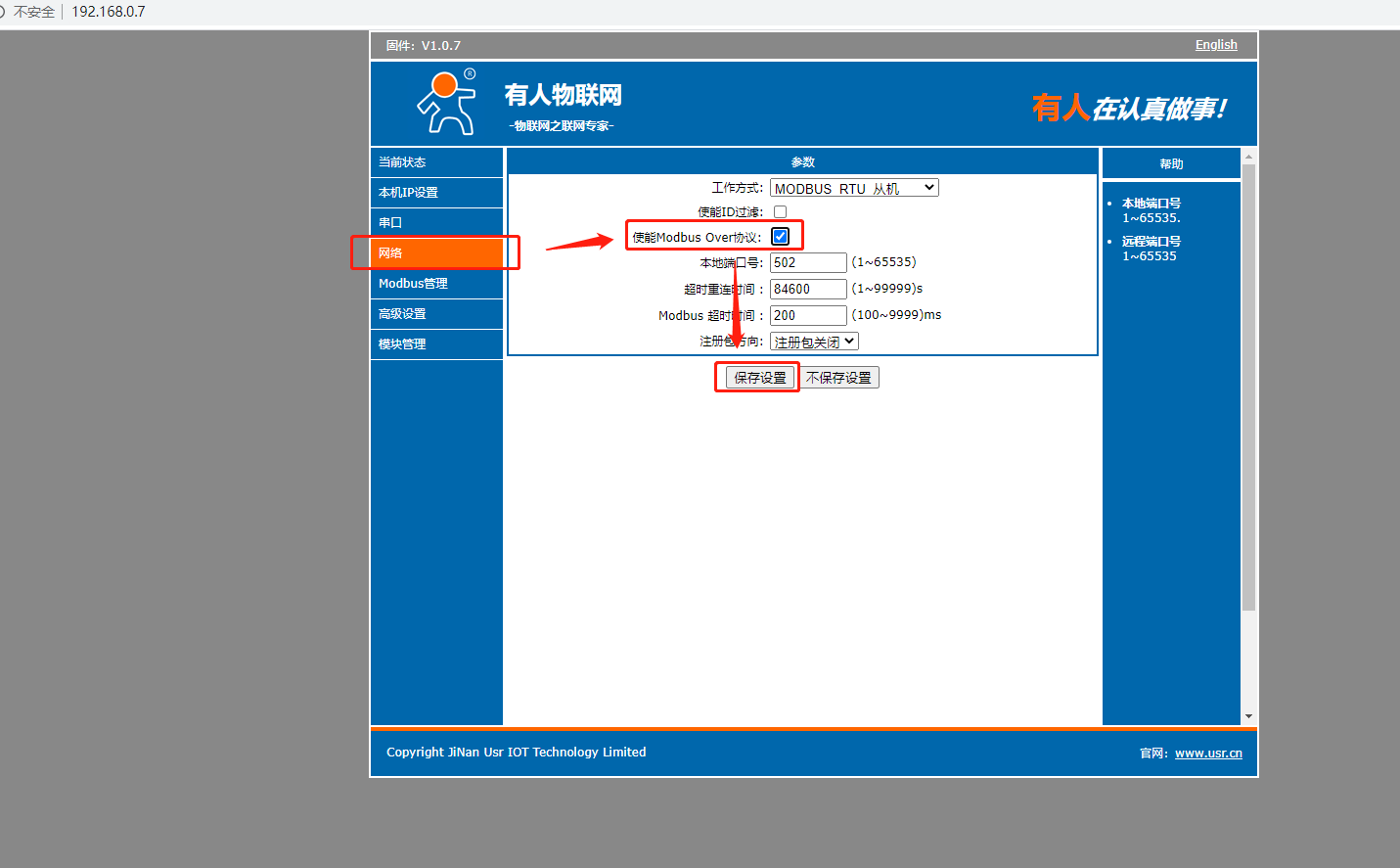 5.進(jìn)入網(wǎng)絡(luò)設(shè)置,可設(shè)置本機(jī)端口,也可以保持默認(rèn)502,勾選MODBUS OVER協(xié)議,開啟透?jìng)?。保存并重啟,完成設(shè)置。