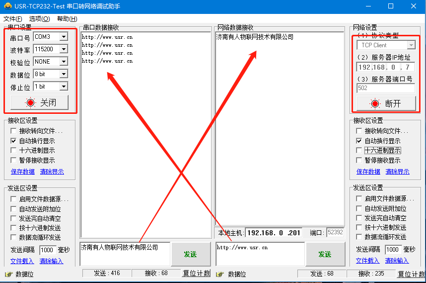 7.. 打開一個(gè)串口調(diào)試助手,串口端要通過(guò)第六步中的串口參數(shù)打開串口,右側(cè)網(wǎng)絡(luò)端連接M511的IP與端口,在網(wǎng)絡(luò)端發(fā)送數(shù)據(jù)給串口之后,串口才可上報(bào)數(shù)據(jù)給網(wǎng)絡(luò)端,及實(shí)現(xiàn)透?jìng)魍ㄓ崱?/p>