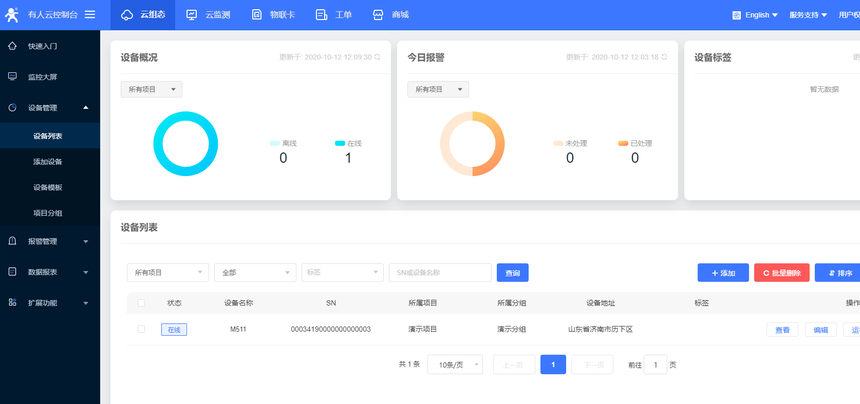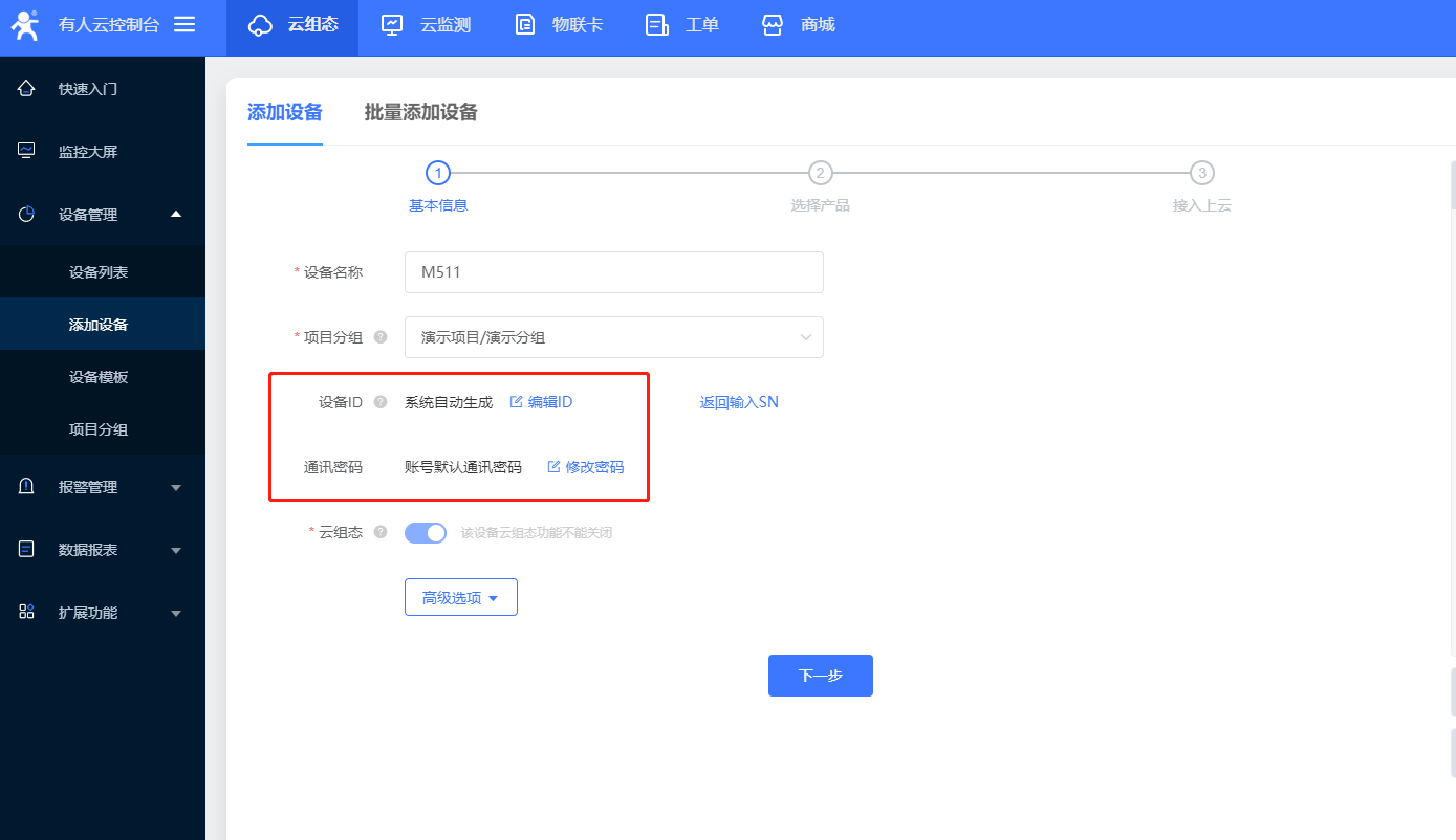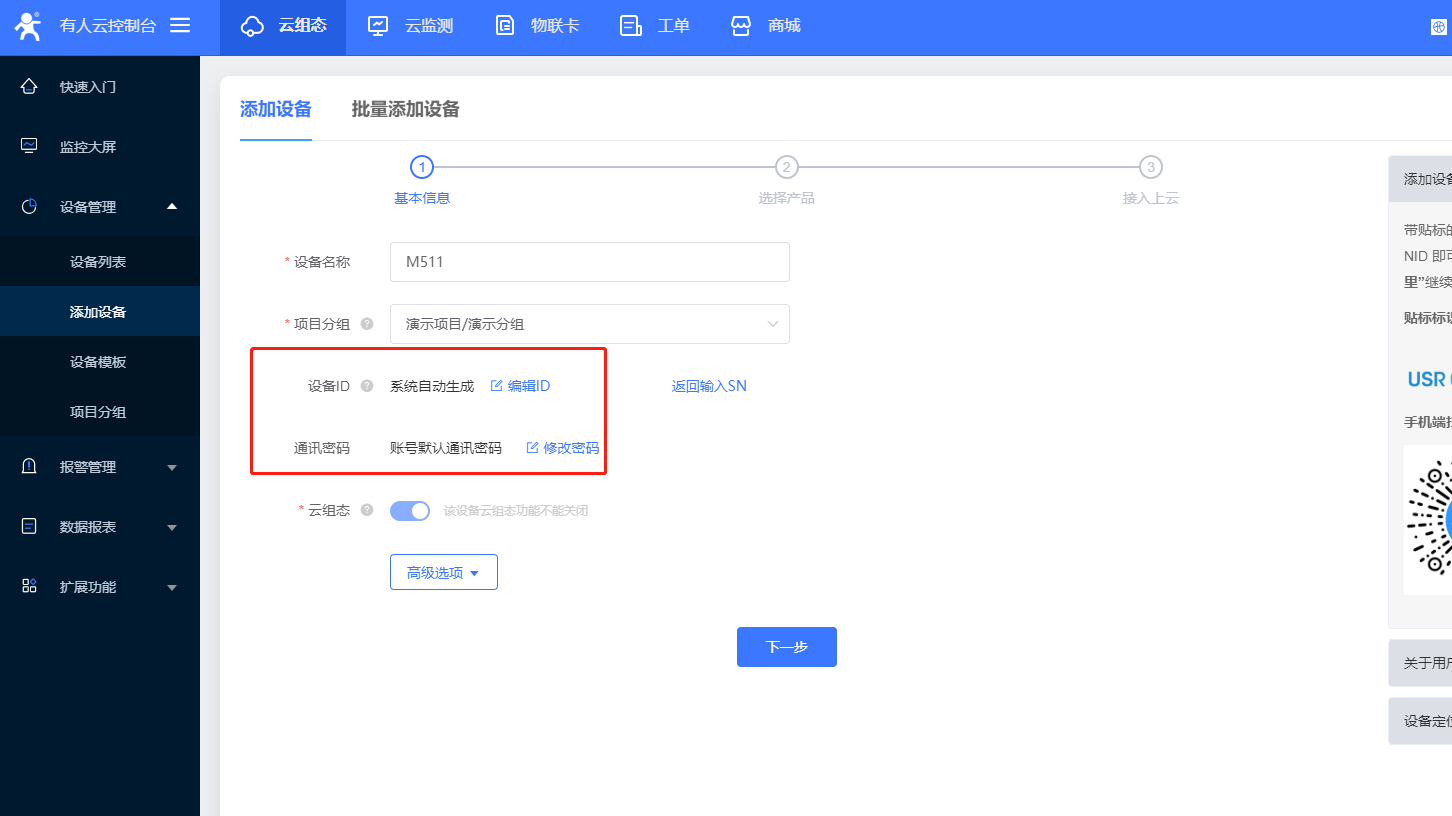 (2)M511不支持SN添加,點(diǎn)擊右側(cè)沒(méi)有SN,默認(rèn)自動(dòng)生成設(shè)備編號(hào)和通信密碼