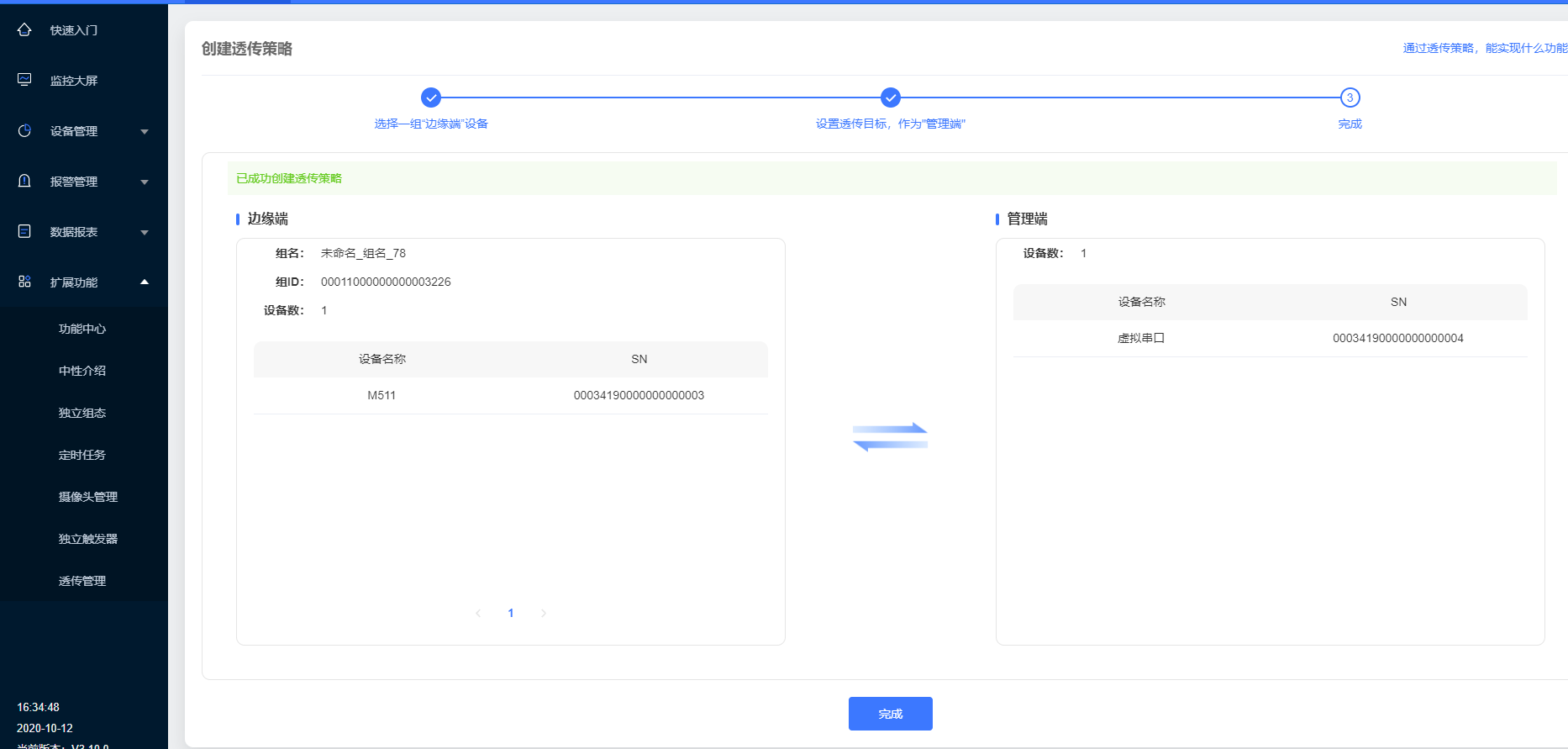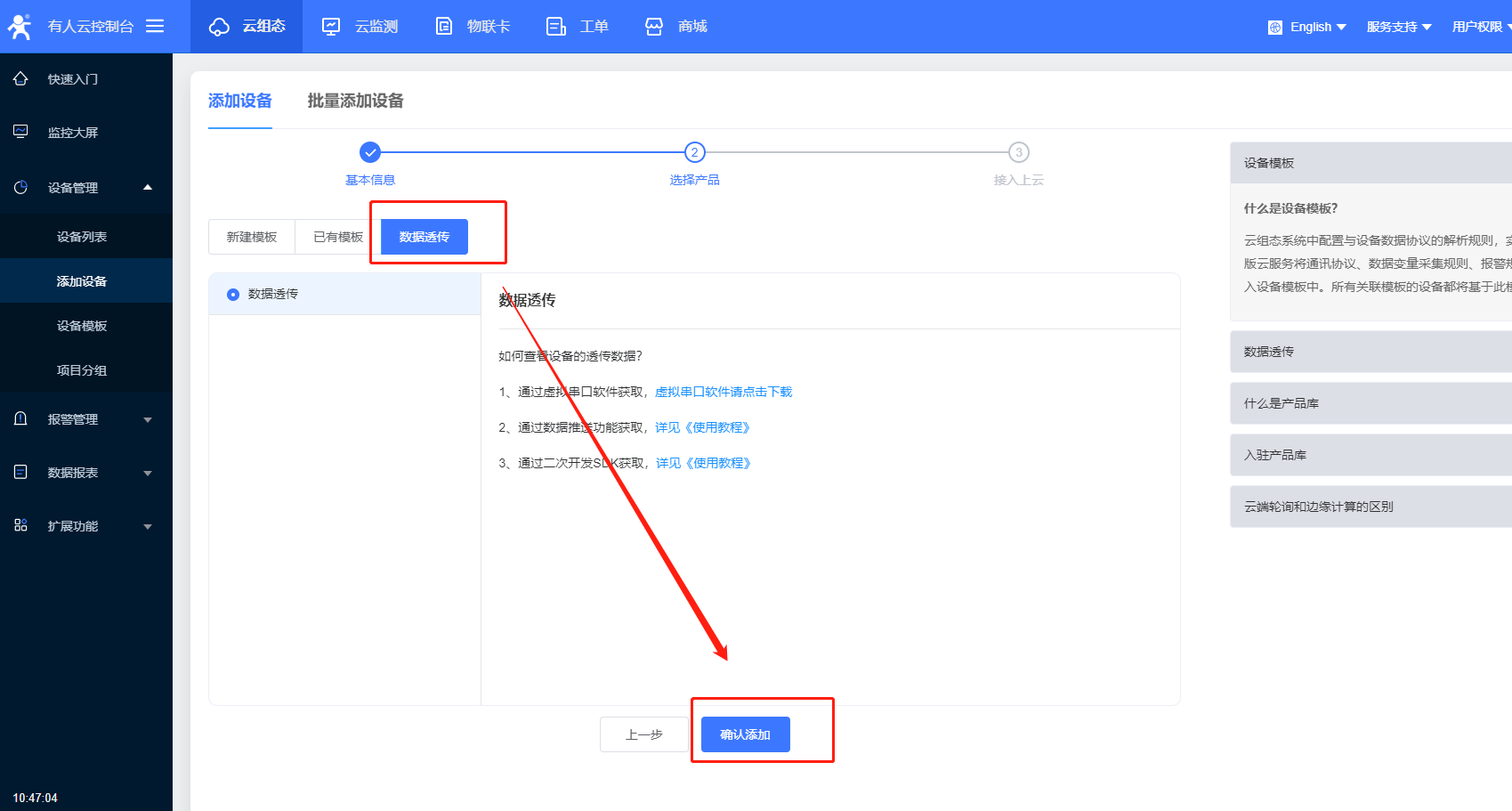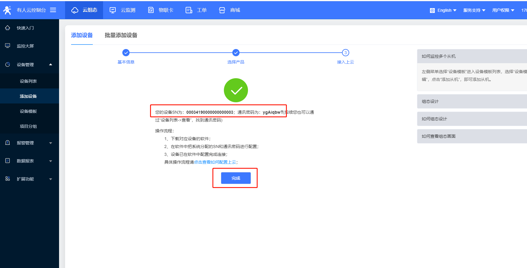 5.可以在這里看到默認(rèn)生成的設(shè)備編號(hào)和通信密碼,點(diǎn)擊完成,云端成功添加設(shè)備