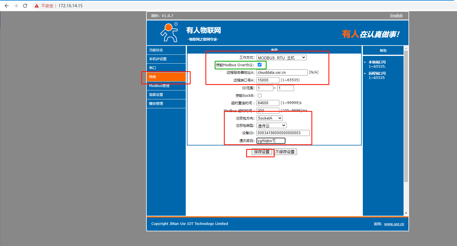 7.設(shè)置串口的參數(shù),工作方式選擇MODBUS RTU主機(jī),遠(yuǎn)程服務(wù)器地址:clouddata.usr.cn,遠(yuǎn)程端口:15000。一定要勾選MODBUS OVER協(xié)議。