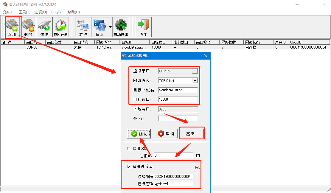 點(diǎn)擊高級(jí),將云上生成的設(shè)備編號(hào)和密碼填入,點(diǎn)擊確定,生成虛擬串口
