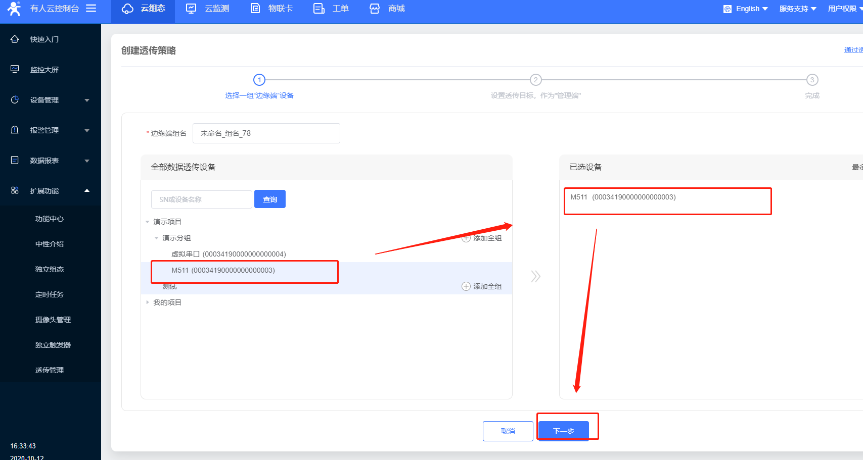 8.透?jìng)鞑呗宰远x命名,先選擇透?jìng)鹘M一側(cè)的設(shè)備,選中,可看到右端出現(xiàn)選中的設(shè)備,點(diǎn)擊下一步