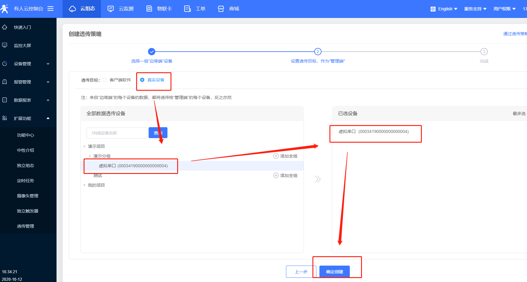 9. 先選擇真實(shí)設(shè)備,然后選中要透?jìng)鞯脑O(shè)備,點(diǎn)擊確定創(chuàng)建