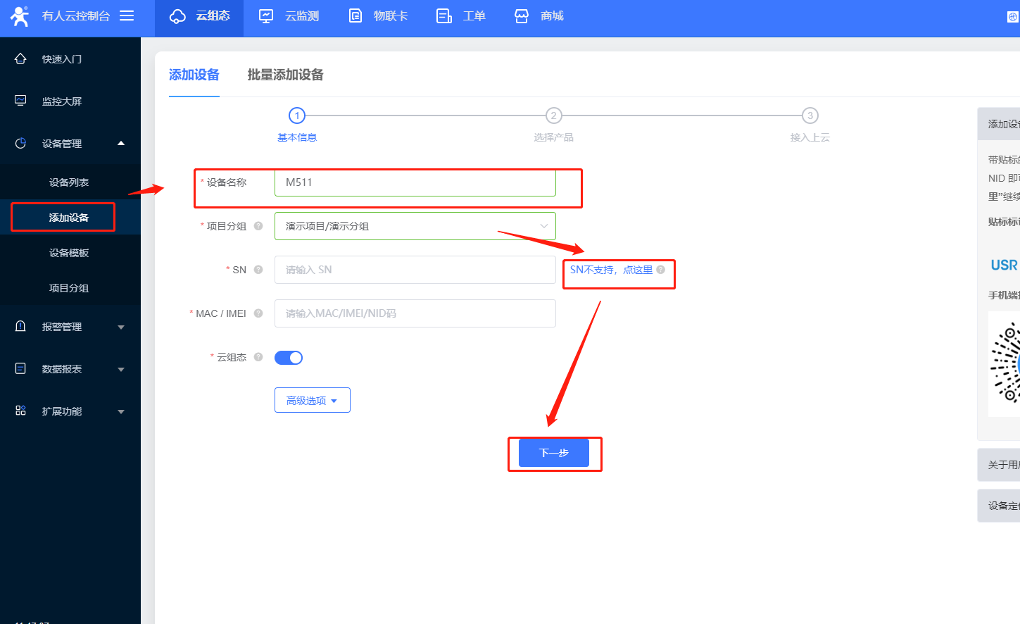 (2)M511不支持SN添加,點擊右側(cè)沒有SN,默認自動生成設(shè)備編號和通信密碼