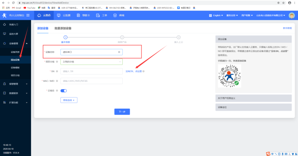 1.點擊添加設(shè)備,添加虛擬串口,點擊沒有SN,默認生成設(shè)備編號和密碼