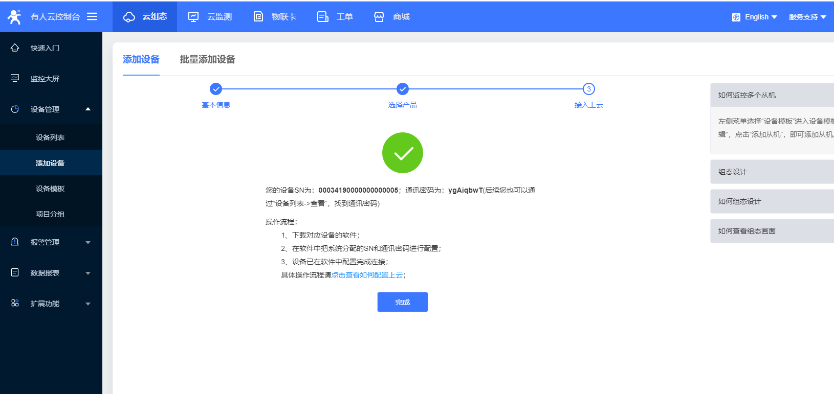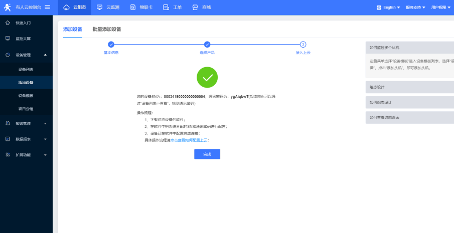 5.可以在這里看到默認生成的設(shè)備編號和通信密碼,點擊完成,云端成功添加設(shè)備