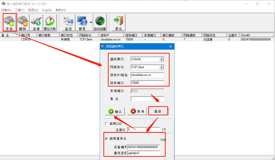點擊高級,將云上生成的設(shè)備編號和密碼填入,點擊確定,生成虛擬串口