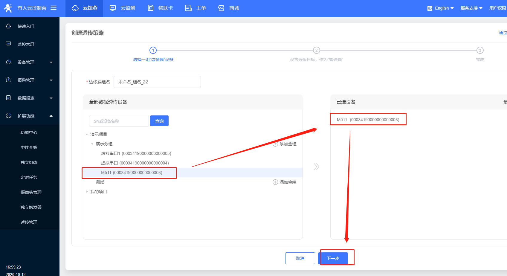 8.透傳策略自定義命名,先選擇透傳組一側(cè)的設(shè)備,選中,可看到右端出現(xiàn)選中的設(shè)備,點擊下一步