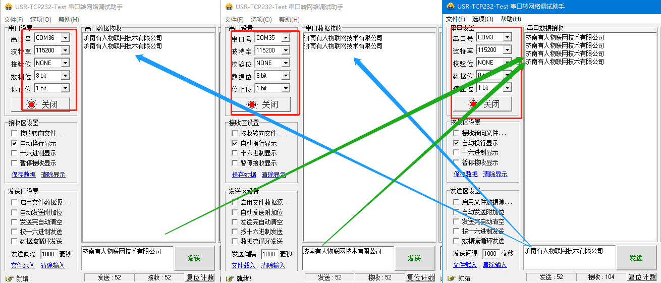 11.用串口調(diào)試助手打開虛擬串口生成的串口和M511的串口(三個串口參數(shù)必須相同),進行數(shù)據(jù)互發(fā)