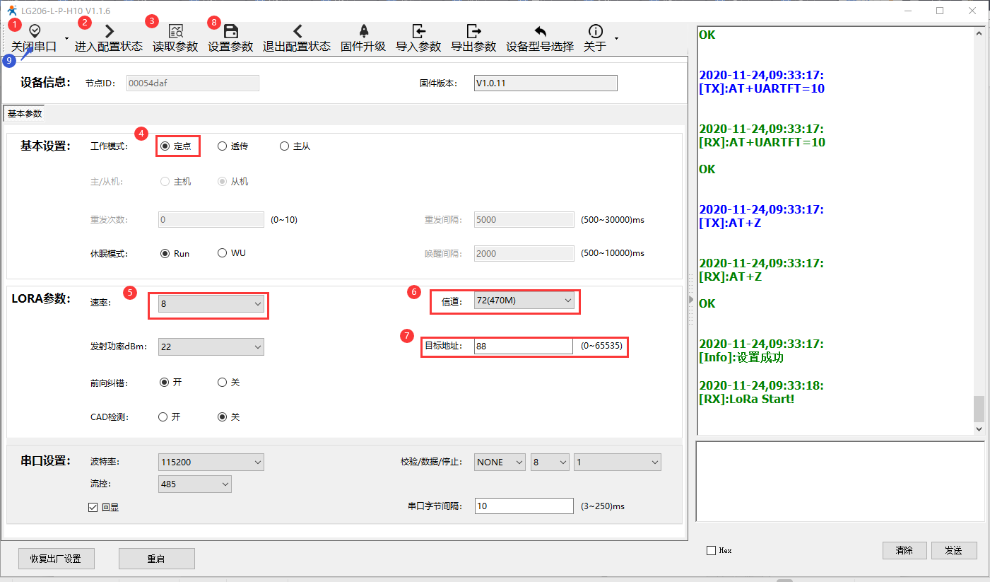 設(shè)備A:定點模式,速率8,信道72,目標(biāo)地址88。