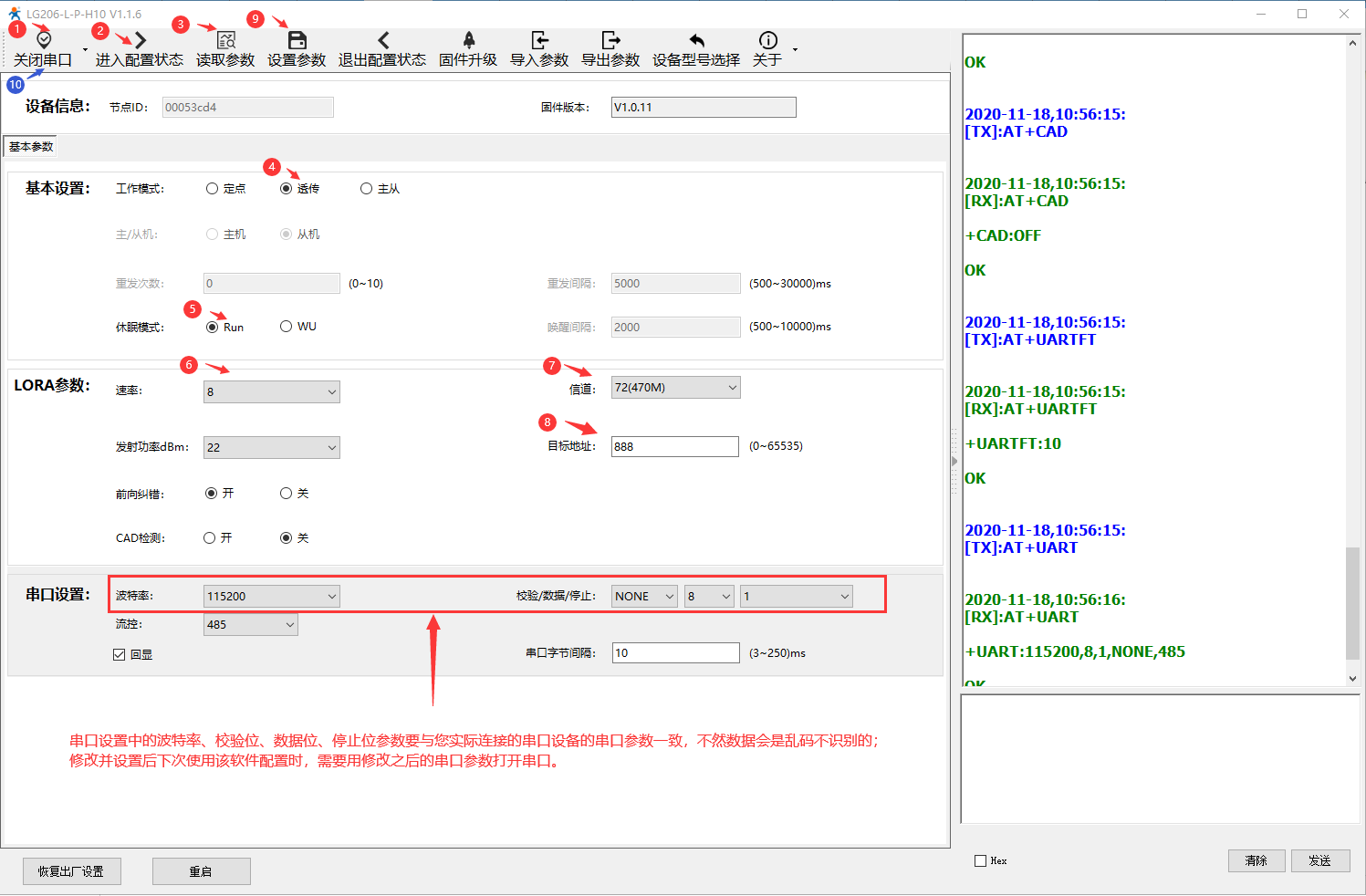 設(shè)備B:透傳模式,速率8,信道72,目標(biāo)地址888。