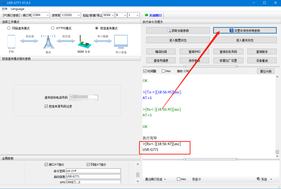 (2)打開串口——進入配置狀態(tài)——設置工作模式為短信透傳,設置目標手機號——設置并保存所有參數(shù)——串口打印開機信息說明設備重啟成功