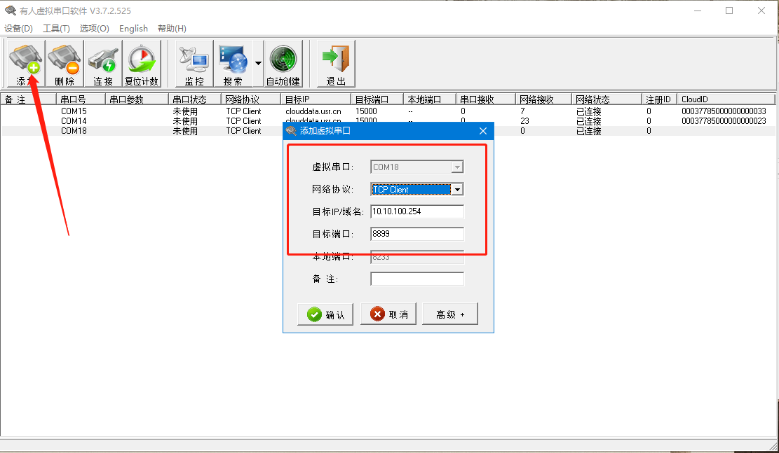 6.打開(kāi)虛擬串口軟件,點(diǎn)擊添加,選擇TCP client,目標(biāo)IP為W610的IP,目標(biāo)端口為W610的本地端口,點(diǎn)擊確認(rèn)