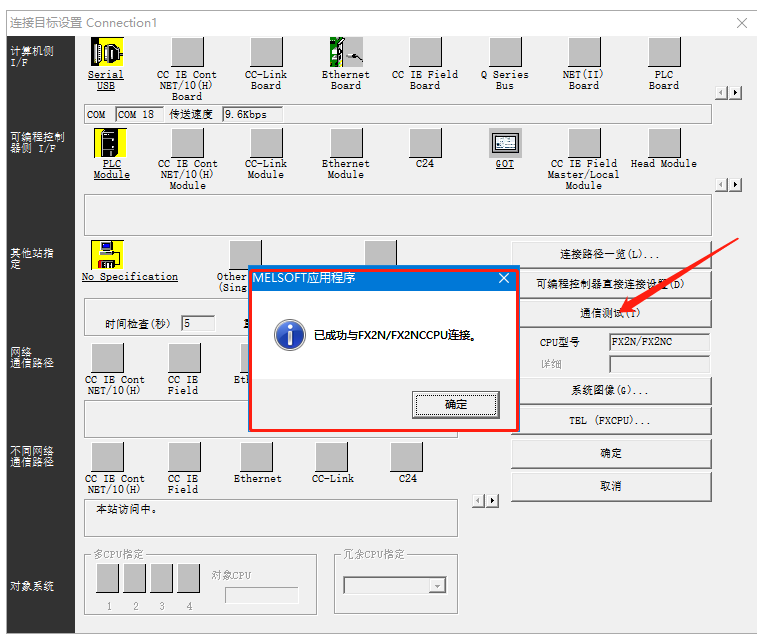9.點(diǎn)擊通信測(cè)試,與PLC連接成功