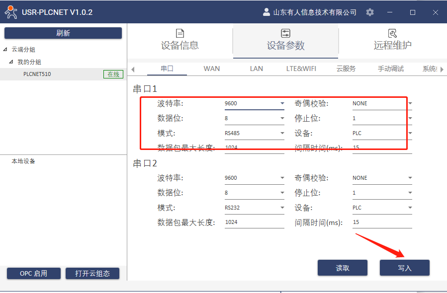 7.設(shè)備參數(shù)》串口》修改串口波特率和串口設(shè)備一致,點(diǎn)擊寫入