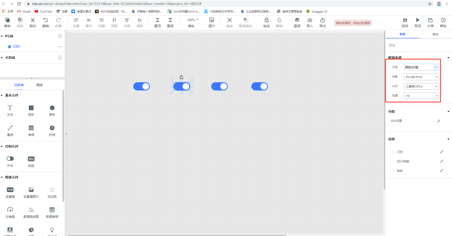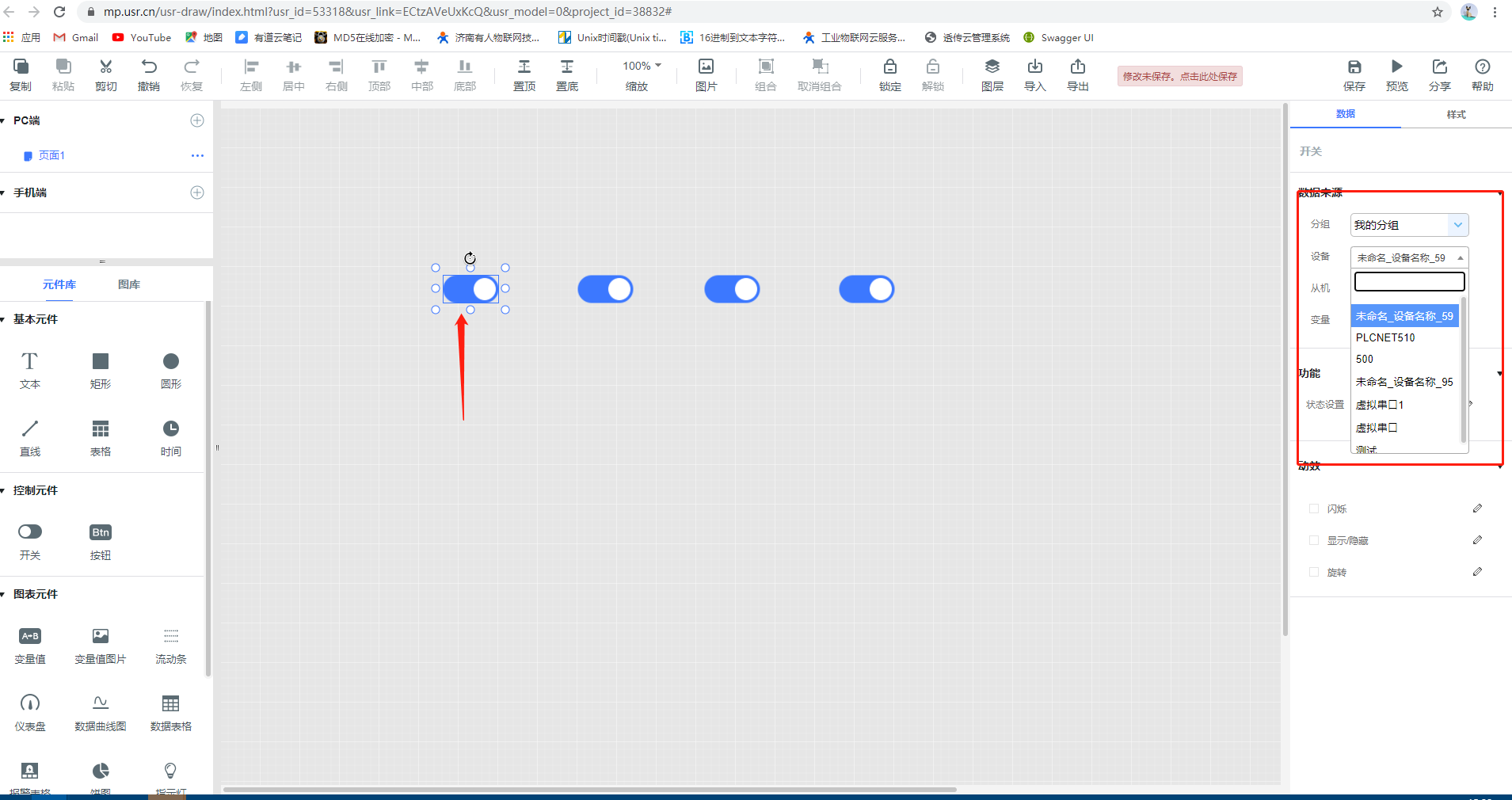 4.添加控件,一個組態(tài)畫面添加多個控件,可以同時關(guān)聯(lián)多個設(shè)備下的多個數(shù)據(jù)點,注意:獨立組態(tài)不支持監(jiān)控大屏顯示