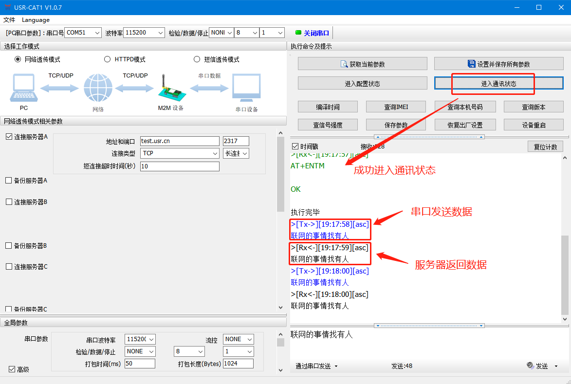2、DTU出廠默認(rèn)連接的是我司的測(cè)試服務(wù)器:test.usr.cn:2317;串口向服務(wù)器發(fā)送什么數(shù)據(jù),服務(wù)器就將接收到的數(shù)據(jù)返回到串口。