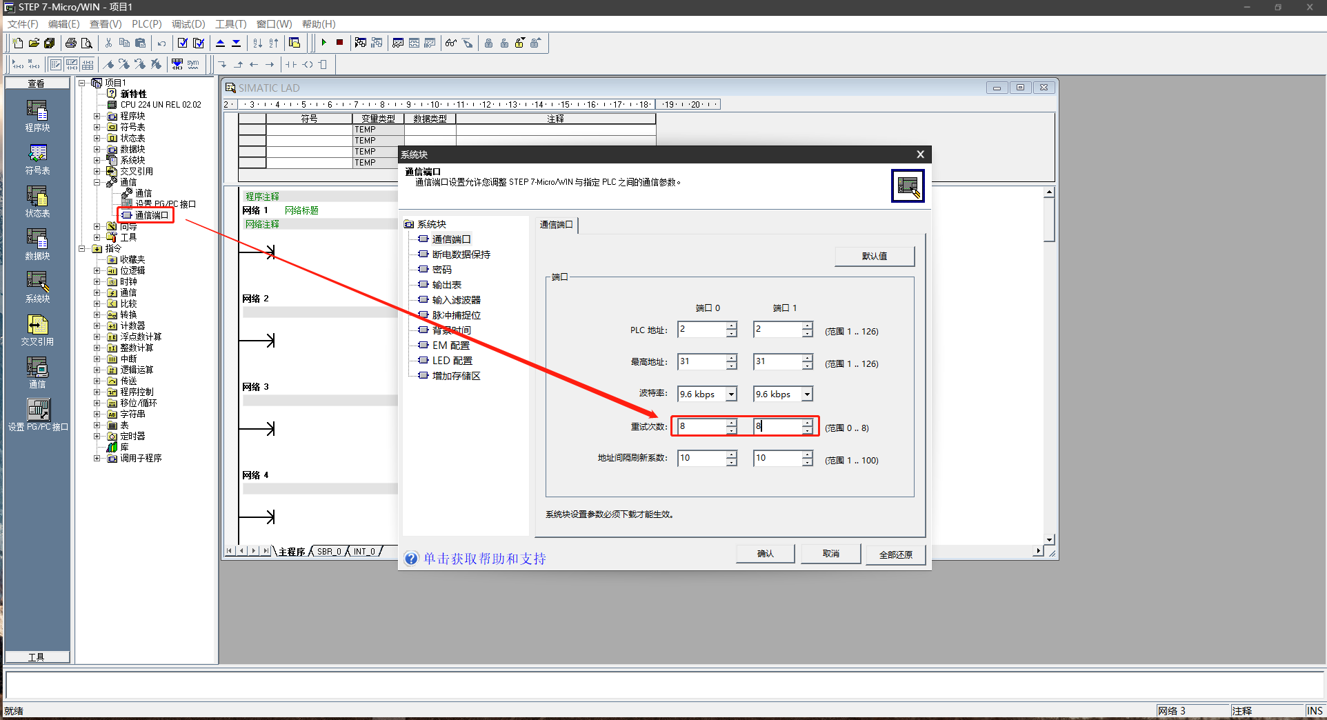 l 設(shè)置上位機-打開 Step7 軟件,配置通信端口參數(shù),點擊項目列表中的“通信”-> “通信端口”設(shè)置重試次數(shù)為最大值 8,然后點擊“確認(rèn)”: