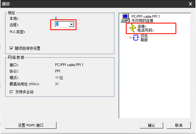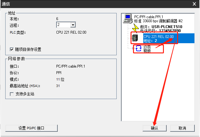 l 雙擊刷新,搜索PLC并建立連接(此處200cn從機地址為默認(rèn)的2號地址)
