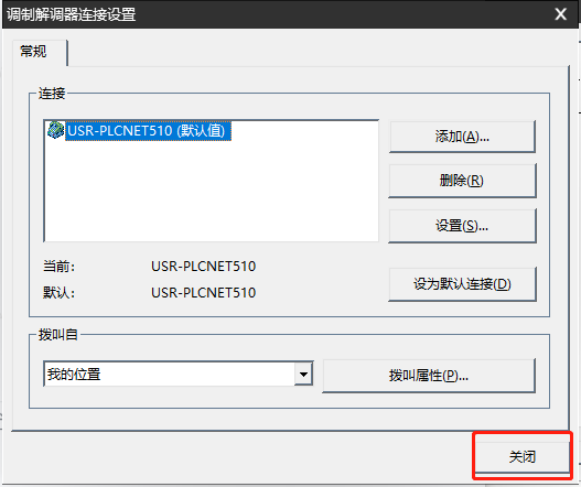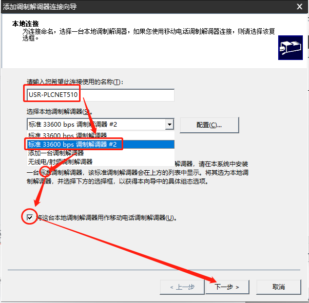 l 點擊“添加”按鈕,在彈出的對話框中輸入連接名稱,比如:USR-PLCNET510。本地調(diào)制解調(diào)器選擇“標(biāo)準(zhǔn) 33600 bps 調(diào)制解調(diào)器”,然后勾選“這臺調(diào)制解調(diào)器將使用偶校驗(11 位組態(tài))”和“將這臺調(diào)制解調(diào)器用作移動電話調(diào)制解調(diào)器”。