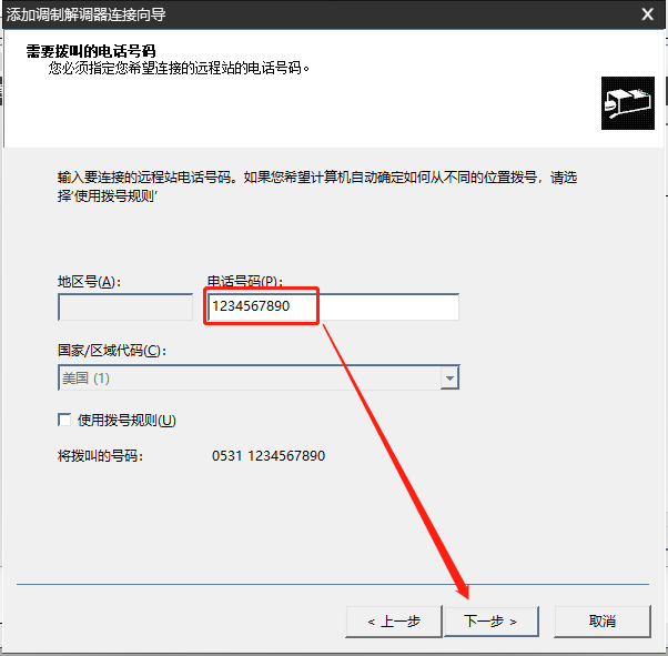 l 設(shè)置調(diào)制解調(diào)器的電話號碼,1234567890,點擊下一步