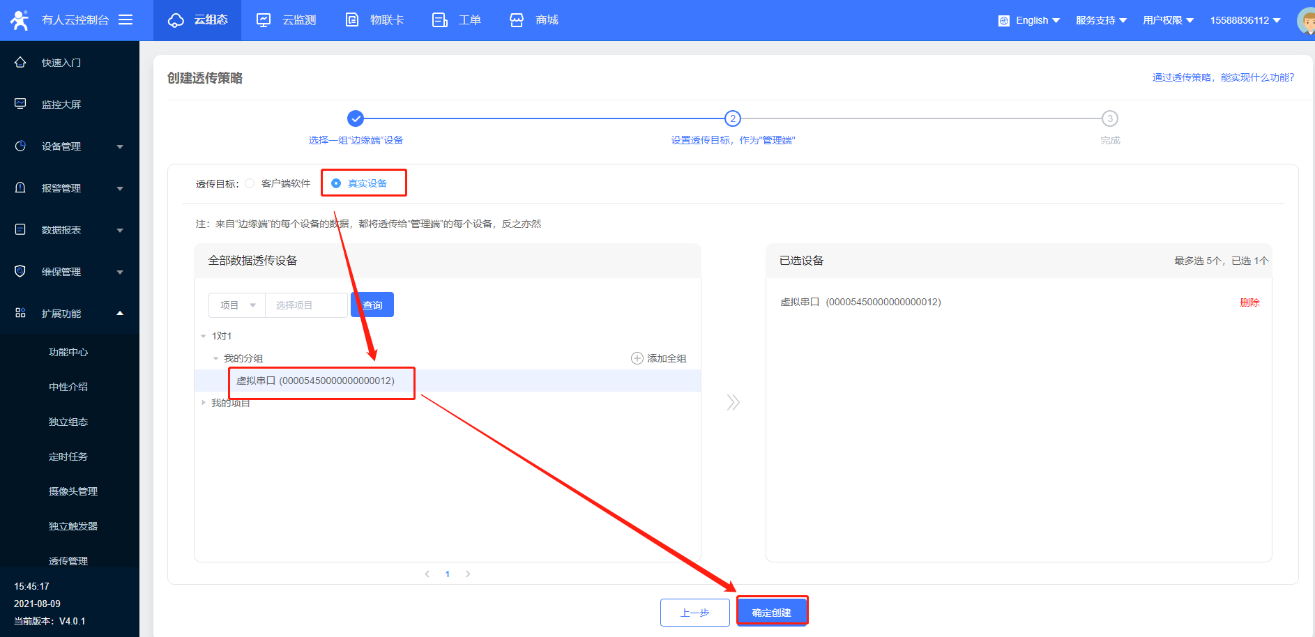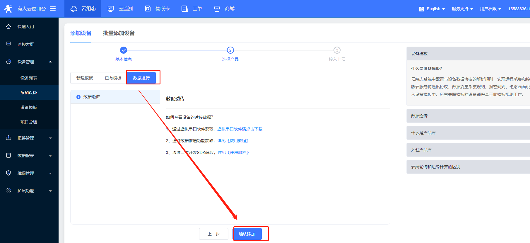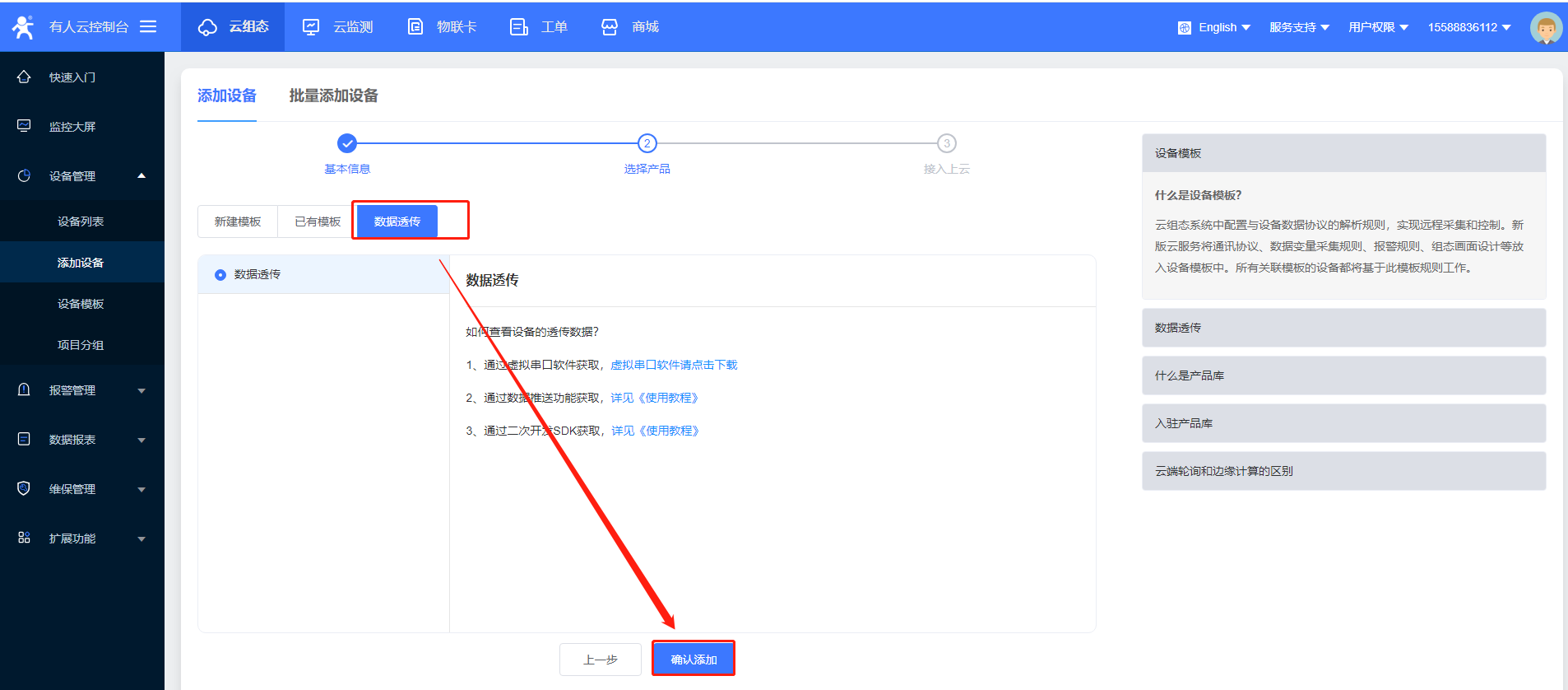 4>再添加一個設(shè)備,用于虛擬串口軟件,選擇數(shù)據(jù)透傳,添加成功后可以在設(shè)備列表中看到