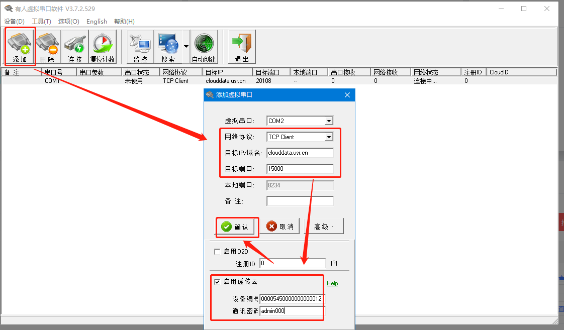 啟用透傳云:設(shè)備編號和通訊密碼見下圖,直接復(fù)制到虛擬串口軟件的編號和密碼即可