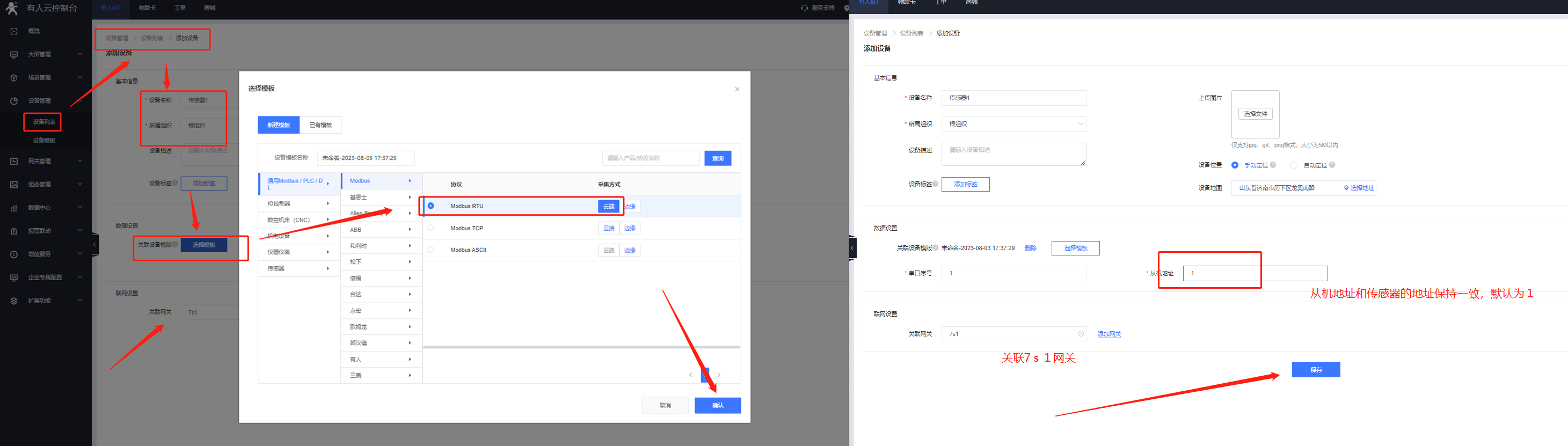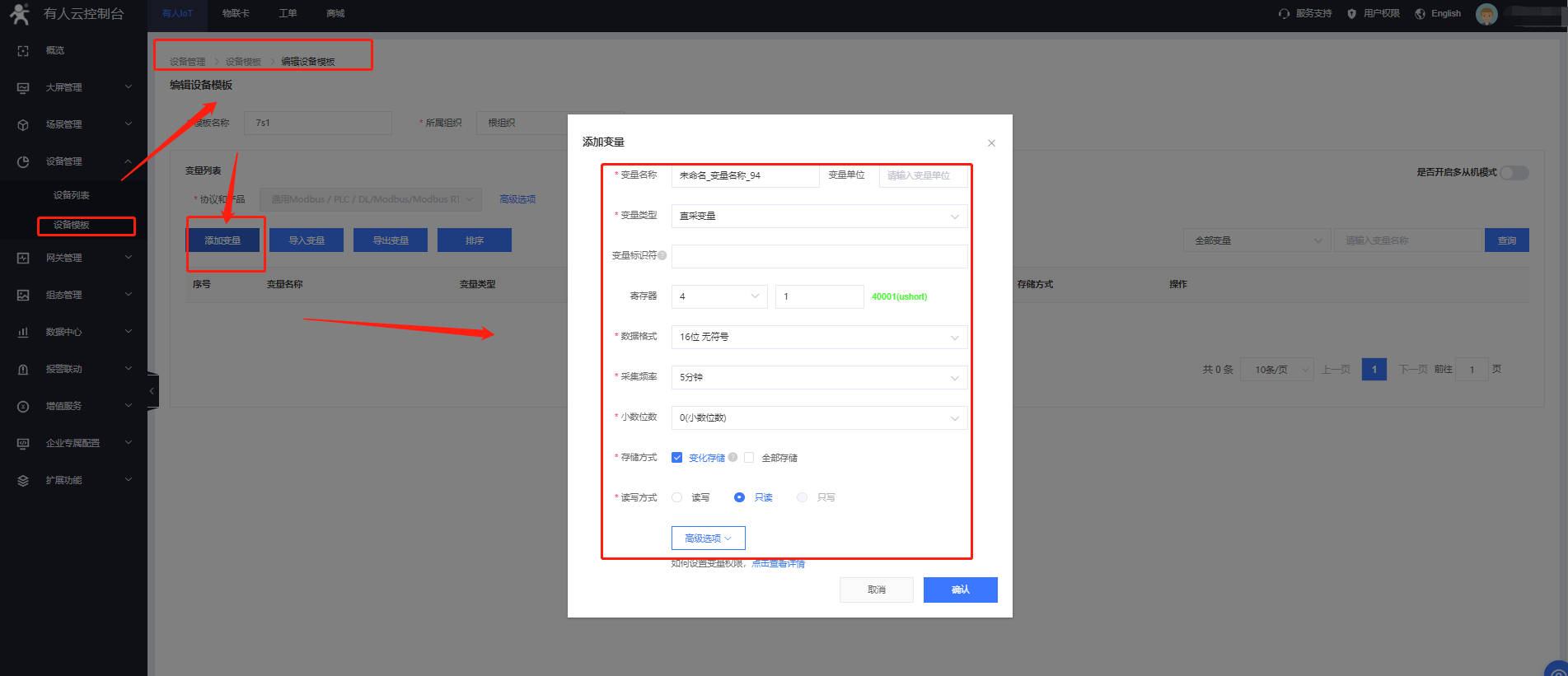3、添加從機設備,關(guān)聯(lián)變量模板,7s1 支持modbus協(xié)議 云端輪詢方式。