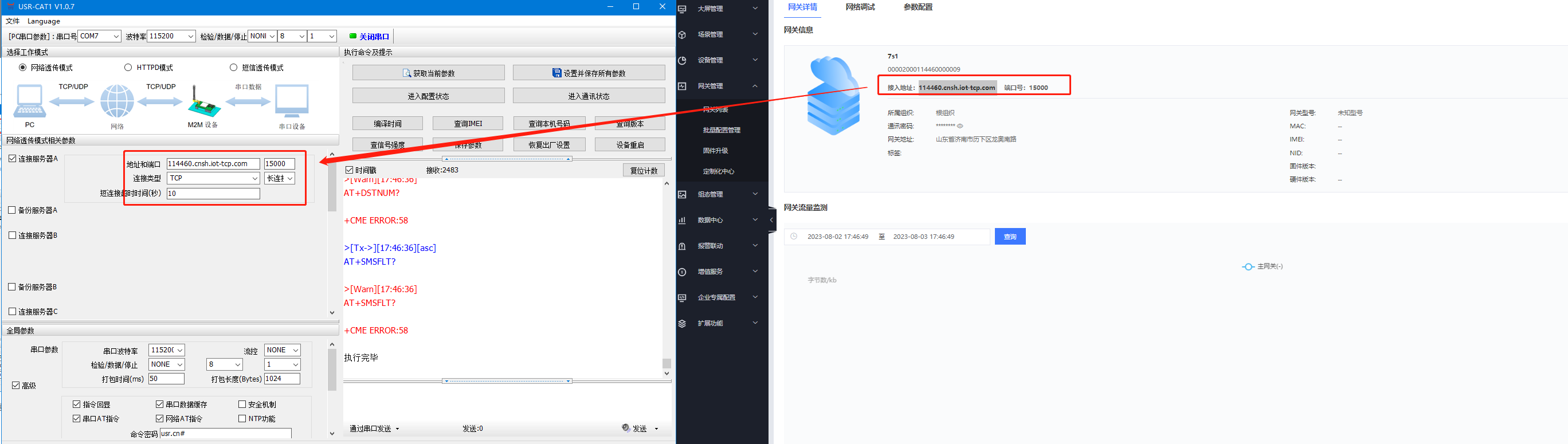 接入地址:114460.cnsh.iot-tcp.com 端口號:15000 寫入服務器IP和端口