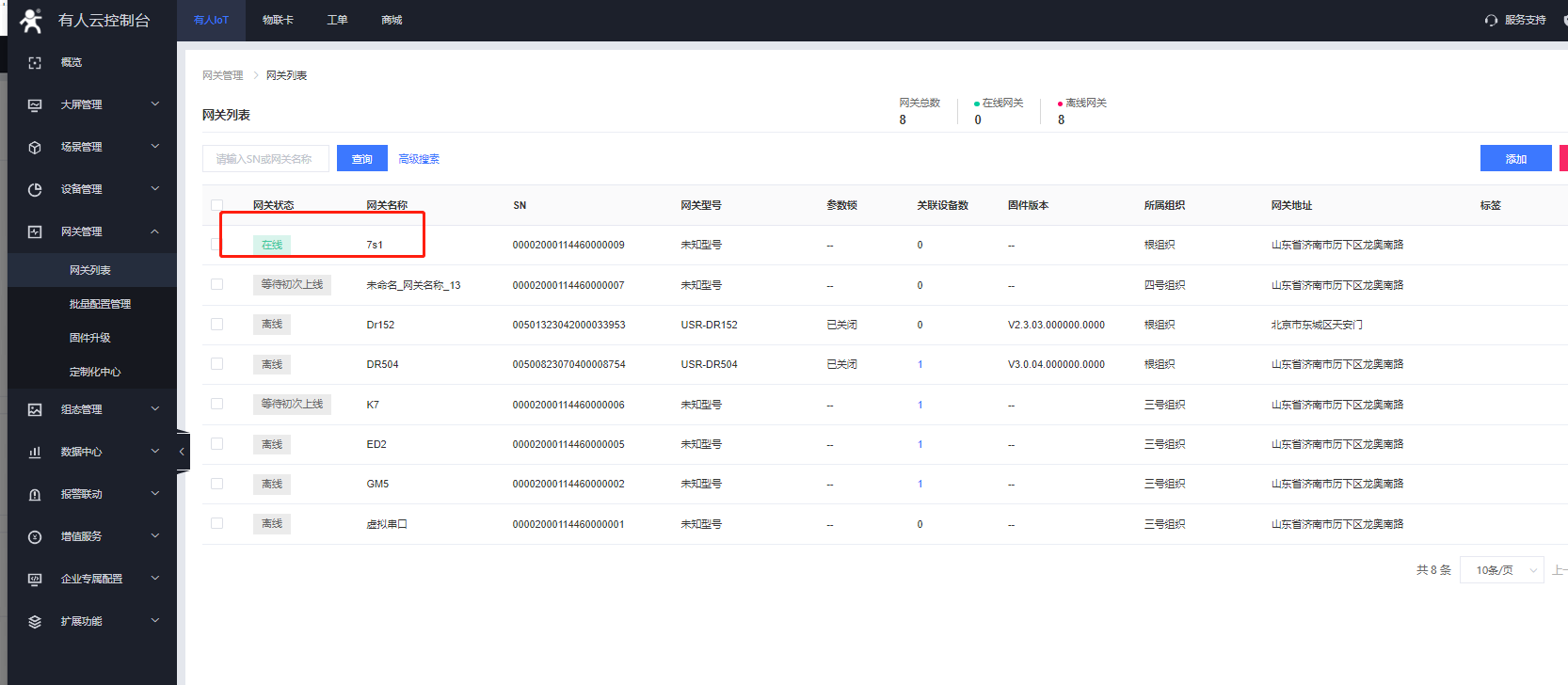 在網(wǎng)關(guān)管理---網(wǎng)關(guān)列表-添加網(wǎng)關(guān),SN和MAC/IMEI可以點擊SN不支持,系統(tǒng)自動生成,不需要客戶自己設置,通訊密碼可以自定義8位密碼。