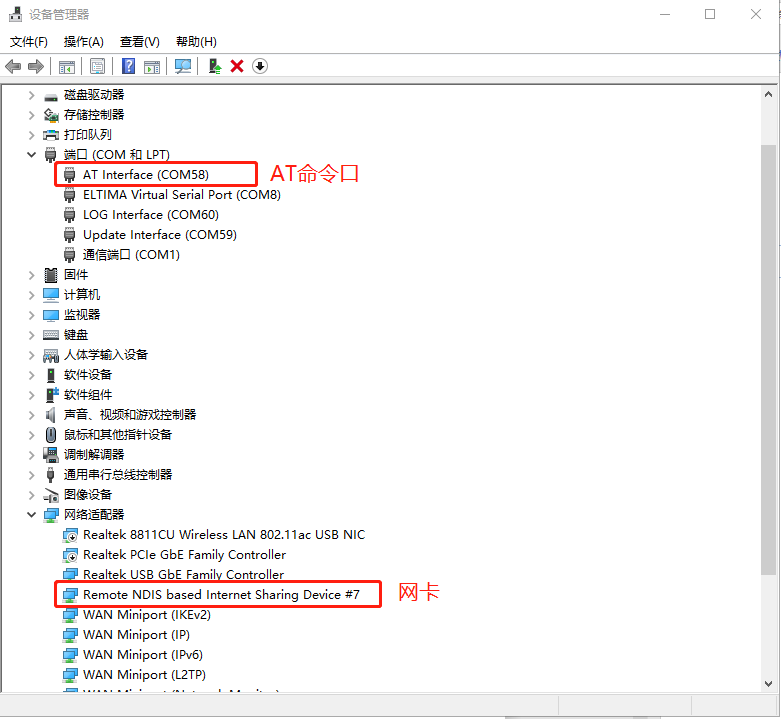 (2)如上圖所示,這個(gè) COM58為 USB 映射出來(lái)的 AT 指令口,我們可以通過(guò)這個(gè)口,發(fā)送 AT 指令來(lái)控制模塊連接外網(wǎng)。