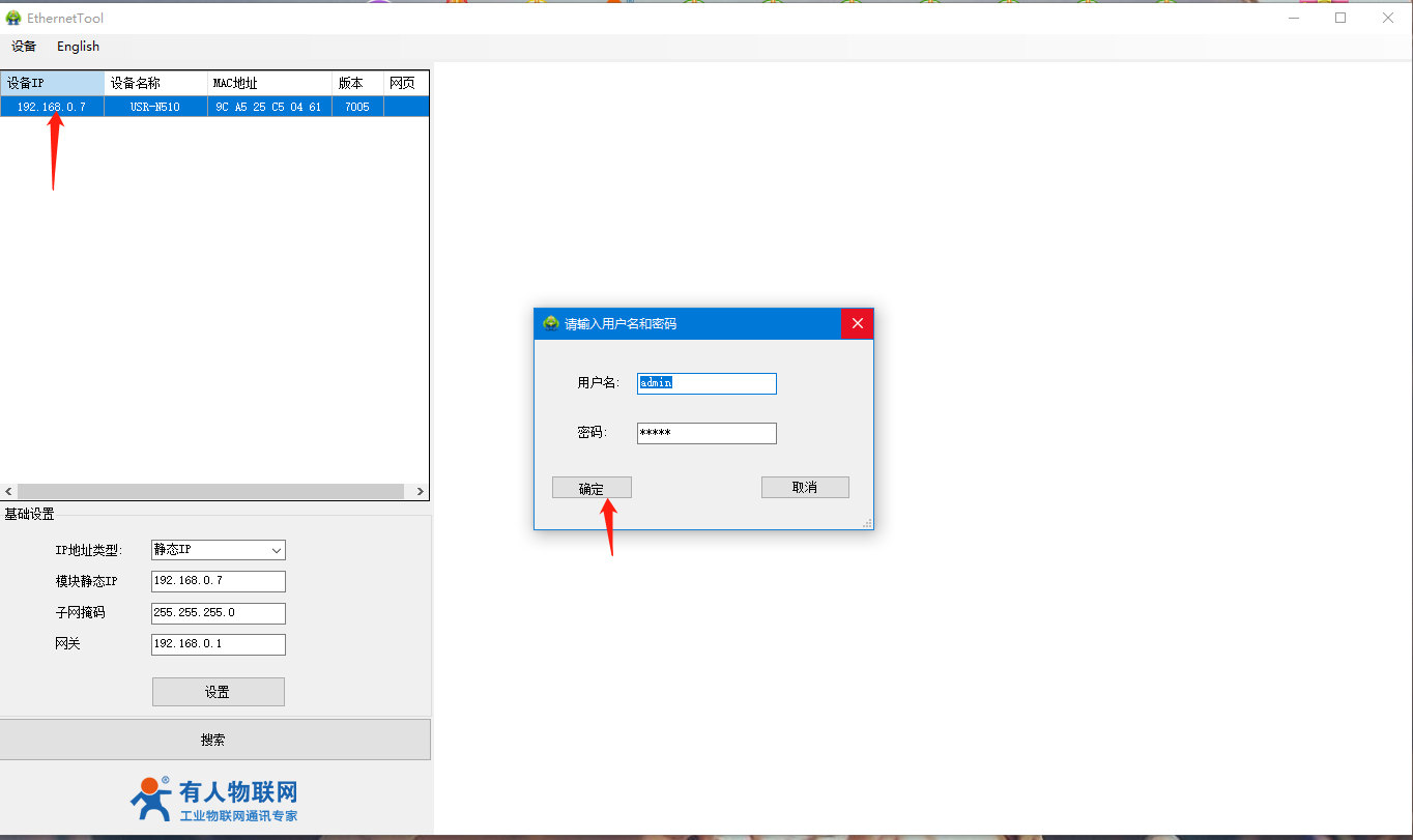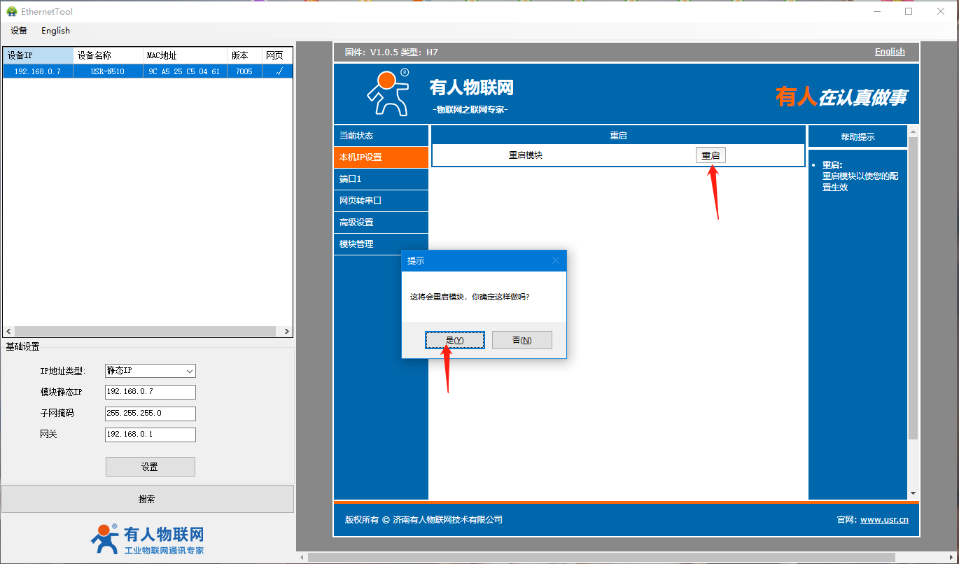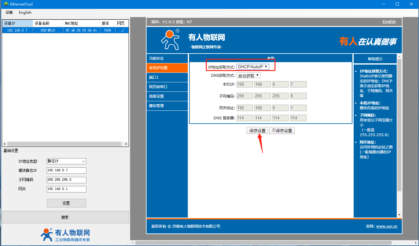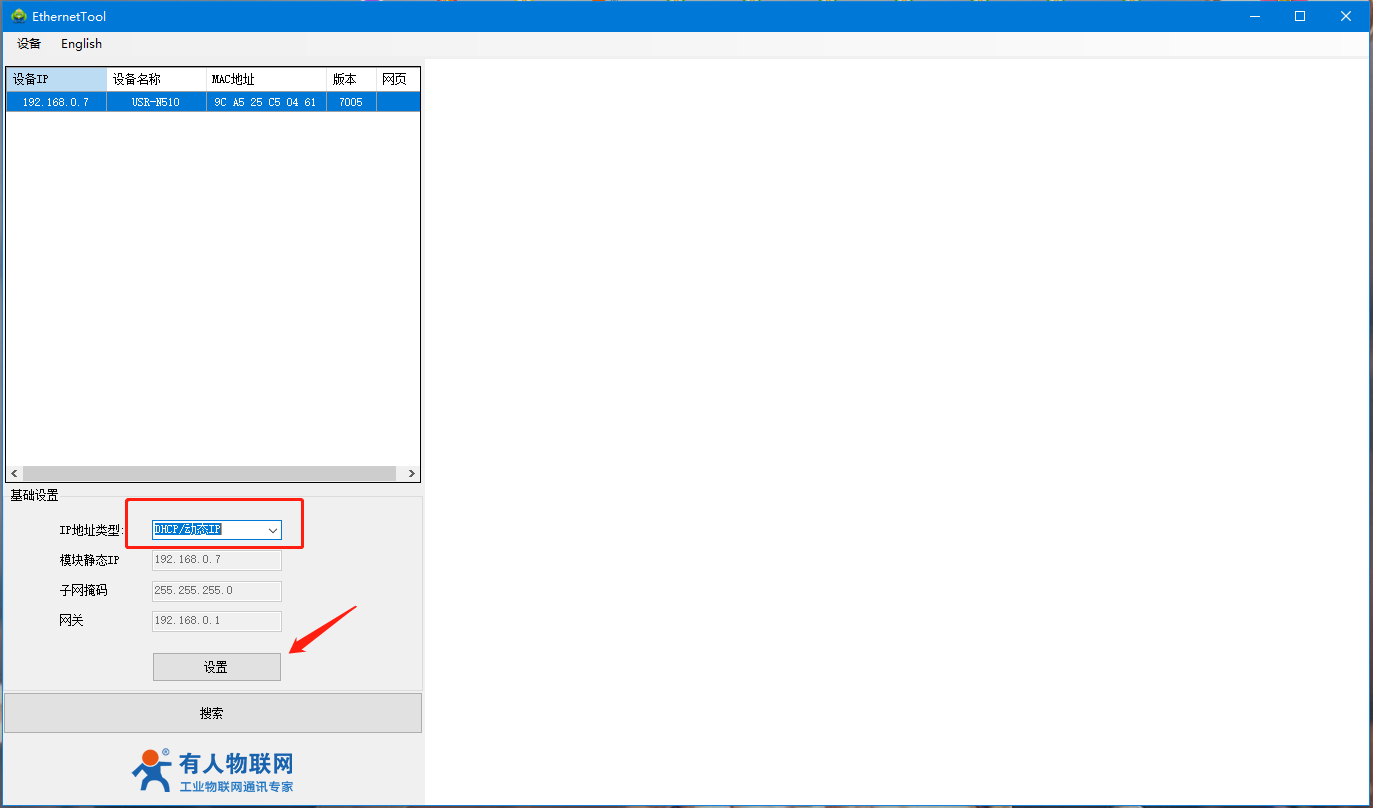 4、打開510(H7)系列設(shè)置軟件,點(diǎn)擊搜索設(shè)備,可以搜索到510,并且可以看到目前510的相關(guān)信息,IP為192.168.0.7(默認(rèn)),設(shè)備名稱為:USR-N510,MAC地址為:9C A5 25 XX XX XX,版本為:7005。