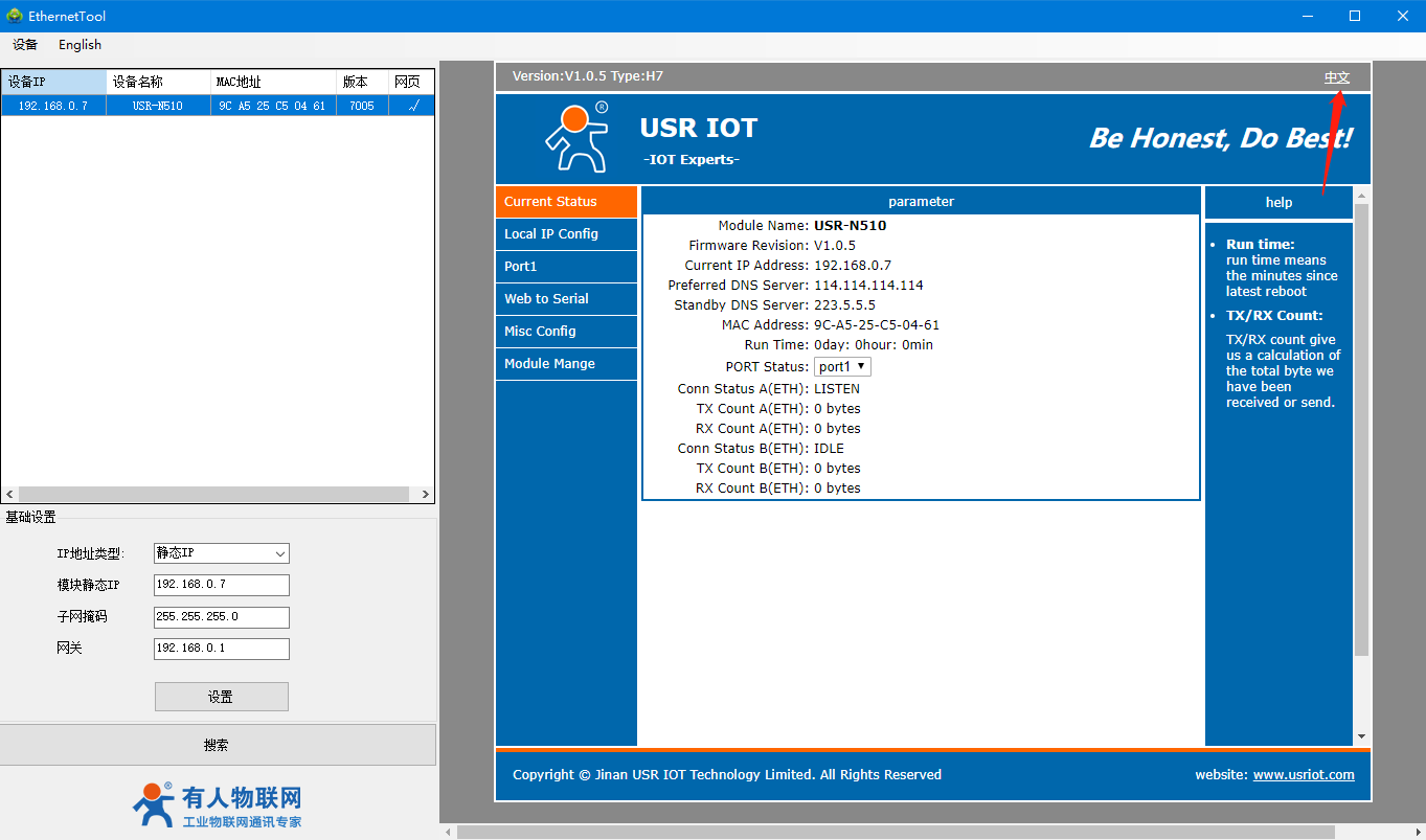 3)、進(jìn)入510設(shè)置軟件內(nèi)部,可以看到設(shè)備目前相關(guān)信息,可在右上角切換成中文模式。