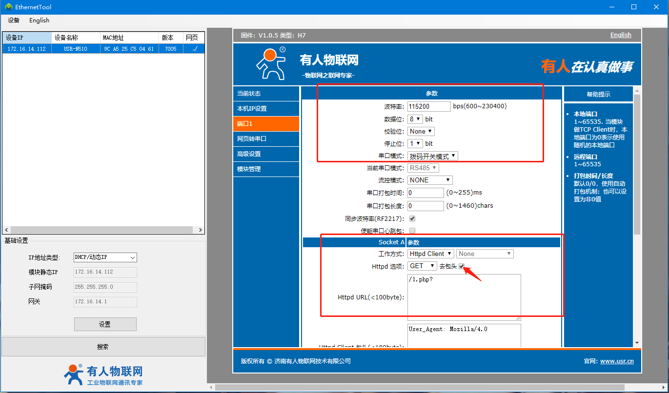 7、在端口1處,確認(rèn)當(dāng)前串口參數(shù)(默認(rèn)為115288,N,8,1)以及串口模式(網(wǎng)頁設(shè)置優(yōu)先級(jí)大于撥碼開關(guān)),默認(rèn)為撥碼開關(guān)模式,所以我們需要將設(shè)備的撥碼撥到相應(yīng)位置,設(shè)置模塊工作方式:HTTP client,HTTPD選項(xiàng)設(shè)置為POST,點(diǎn)擊去包頭,最后我們獲取到的數(shù)據(jù)將不會(huì)存在包頭,URL為:/2.php? 。