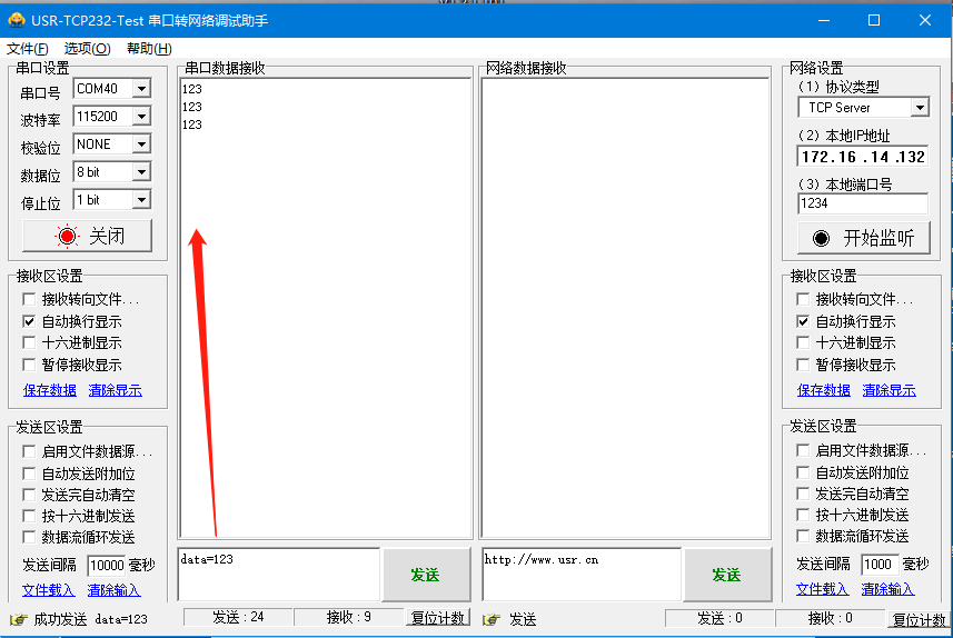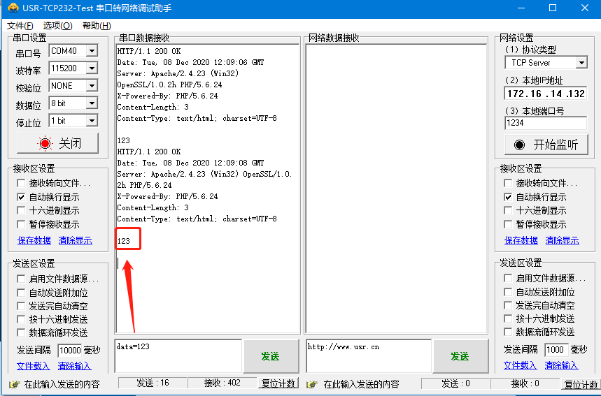 發(fā)送123,收到返回?cái)?shù)據(jù)123