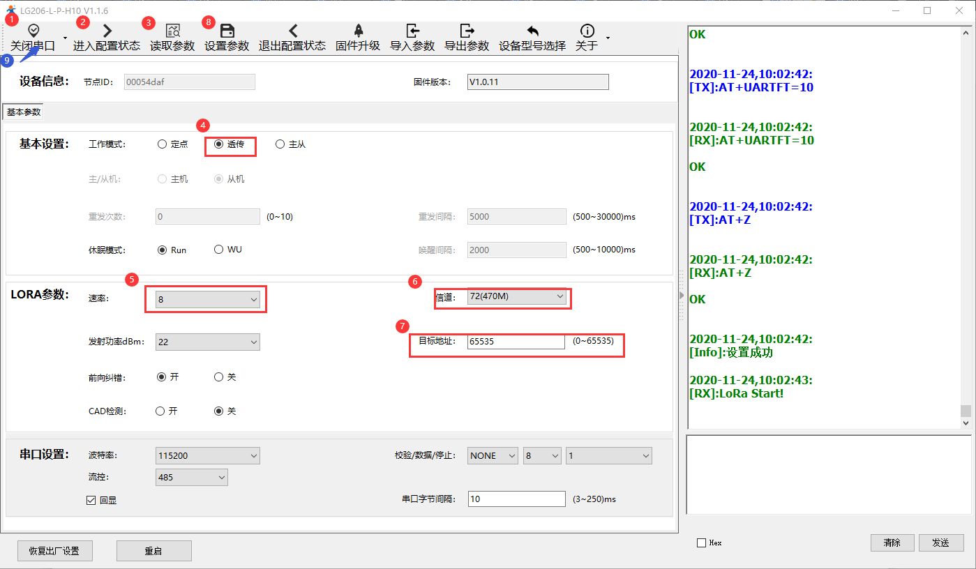 廣播設(shè)備參數(shù):透?jìng)髂J?,速率等?jí)8,信道72,目標(biāo)地址65535。