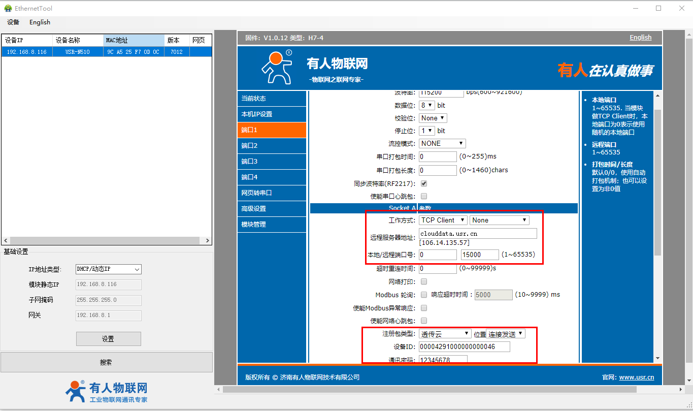 點(diǎn)擊端口參1數(shù),工作方式TCP client,遠(yuǎn)程服務(wù)器地址clouddata.usr.cn,遠(yuǎn)程端口15000。點(diǎn)擊保存設(shè)置。