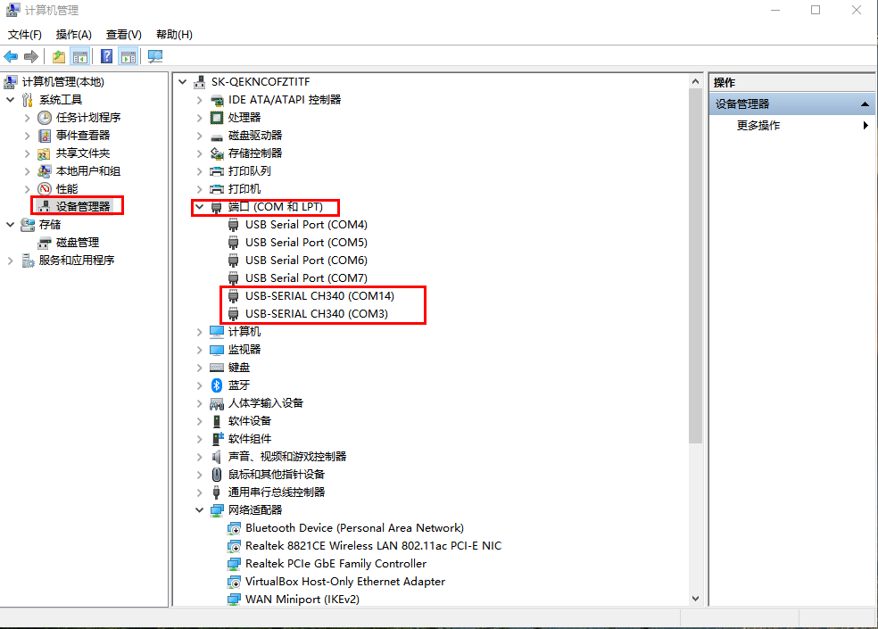 點(diǎn)擊電腦計(jì)算機(jī),右擊鼠標(biāo),點(diǎn)擊設(shè)備管理器,查看端口,確認(rèn)2條USB-RS485串口線的COM口號,有人測試電腦是COM3和COM14