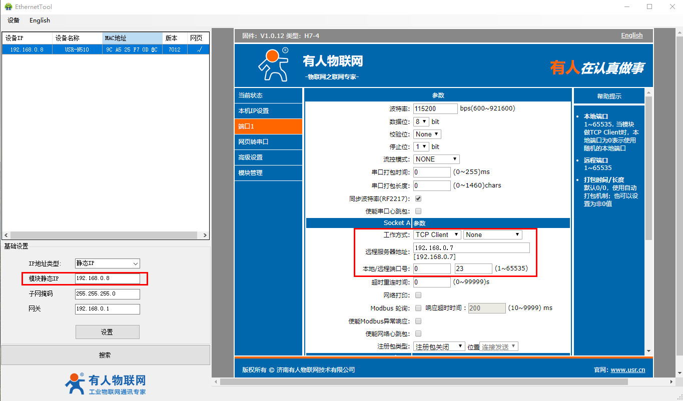 工作方式設(shè)置TCP client,遠(yuǎn)程服務(wù)器地址填192.168.0.7,遠(yuǎn)程端口填23。本地端口填0。
