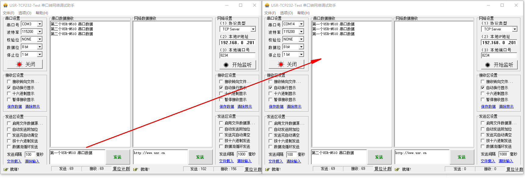兩個(gè)N510的2個(gè)網(wǎng)口用一根網(wǎng)線直連,兩個(gè)N510的串口分別接USB-RS485串口線接電腦,打開2個(gè)串口助手,對應(yīng)各自N510串口參數(shù)。